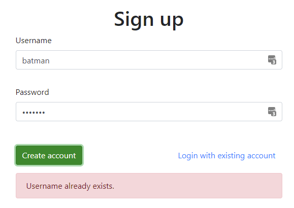 If we now try to create new account with already existing username, we will get nice error message: