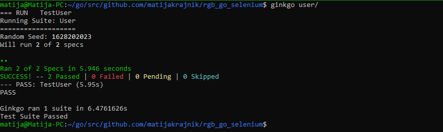 We start by creating TestUser function where we parse passed CLI arguments, register fail handler, which is here used to connect Ginkgo and Gomega, and then we run spec named User. For organizing specs we are using Ginkgo functions Describe and It. We also defined functions to be executed before and after each test case using BeforeEach and AfterEach handlers. App that we are testing doesn’t have many IDs for HTML elements (which is also often case in real production applications), so I had to be creative with locating elements. For that CSS selectors were mostly used when there was no ID or link text available.